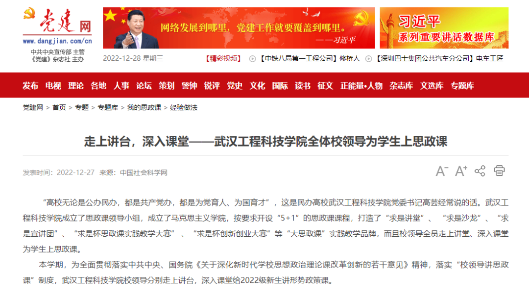 近日,我校“全体校领导走上讲台,深入课堂,为学生上思政课”被中国社会科学网、党建网等多家权威媒体报道,引发网友热烈讨论。